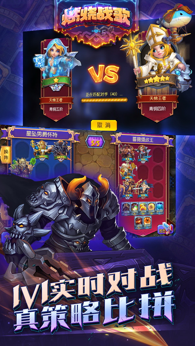 《燃烧战歌》独创双卡牌模式,打破传统卡牌桎梏。动态英雄卡与魔法卡相互配合,营造千变万化的进攻组合。动态英雄卡牌,霸气进攻如入无人之境;独创的魔法卡,轻松划屏释放,辅助加成、特效控场、愈合治疗,为战斗赋予更多变化,让玩家感受新鲜刺激的游戏体验。《燃烧战歌》采用独特的Doll-Extra技术制作,营造炫动流畅的靓丽画质,开创卡牌手游全新时代!